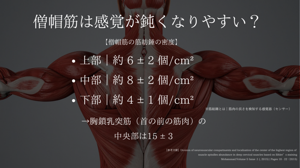 僧帽筋の筋紡錘の分布。首に比べて低い傾向があります